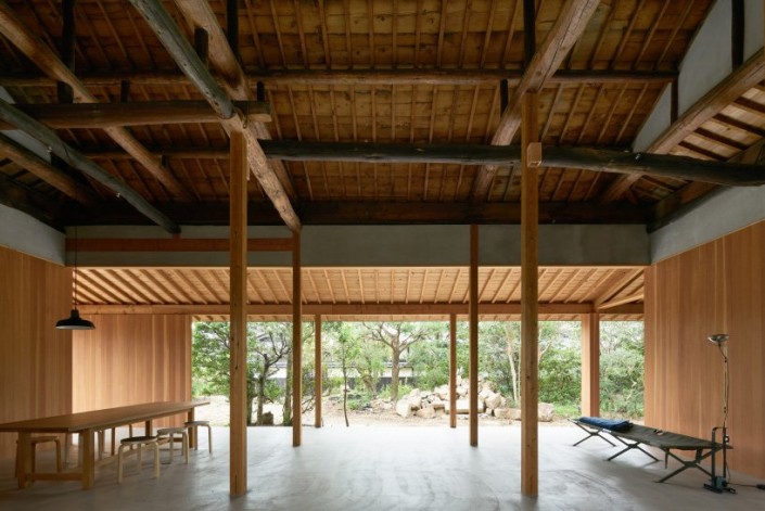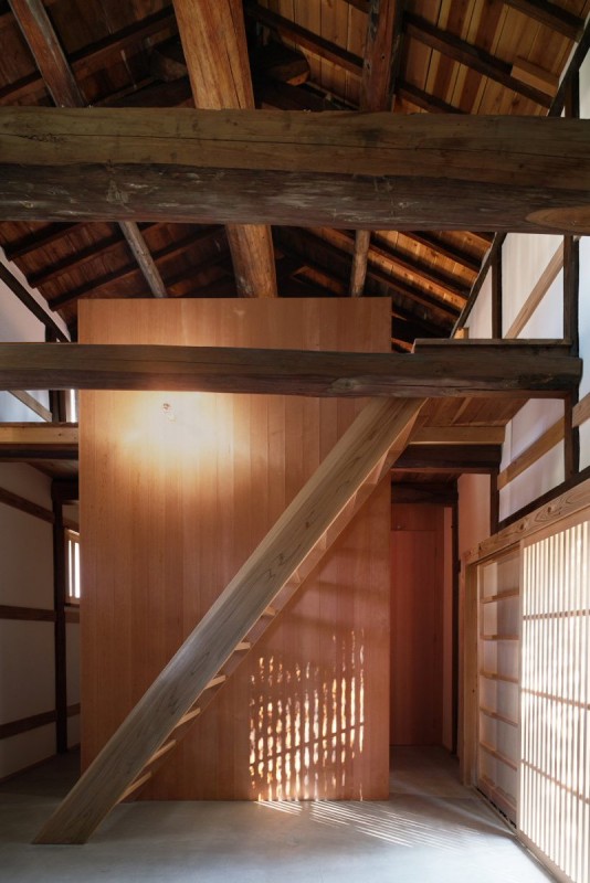 Дом находится в японском городе Курасики. Старинный дом восстановила строительная компания. Архитекторы придали ему современные черты и создали открытые пространства. При этом сохранили историческую крышу, установив под ней прочную конструкцию из деревянных колонн.