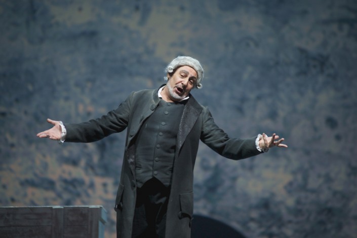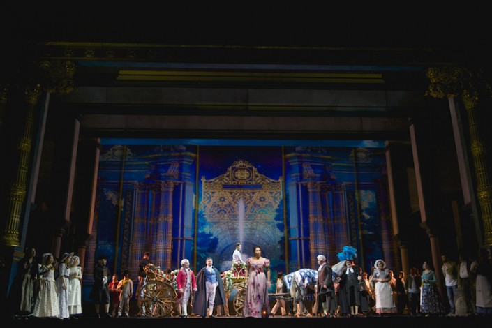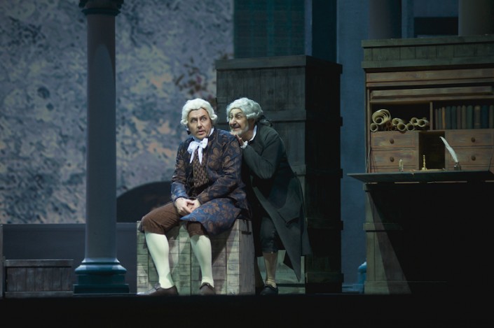 Богатая сценография на протяжении всего спектакля поражает своим великолепием взоры публики. За окнами масштабного итальянского дома происходят постоянные перемены: то порывистый ветер гнет деревья, то льет проливной дождь, а еще зрителей радуют роскошные пейзажи города, пышно цветущие растения и корабли. У каждой картины есть свое значение: явления природы передают настроение героев. Так, ливень начинается, когда граф пытается освободить свою возлюбленную из-под гнета Бартоло, гром и молния, изображенные на 4D-проекции в сцене "Клевета", аллегорически говорят нам о магической силе слова, которое может уничтожить репутацию любого человека. В финальной сцене зарево фейерверков заливает золотым цветом все пространство площади. Салюты - символ радости - сопровождают приезд графа Альмавивы вместе со своей возлюбленной Розиной на удивительно роскошной карете. В каждой из этих сцен читается неизменно тонкое чувство стиля Эцио Фриджерио. Особый почерк мастера узнается и в колоннах, выполненных в сине-золотом цвете, передвигаются они плавно, в автоматическом режиме, будто танцуют под искрометную музыку Россини.