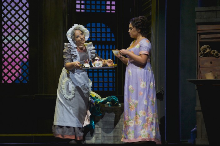 Благодаря последним современным технологиям Альфонсо Антониоцци смог воспользоваться в своей постановке рядом интересных режиссерских приемов, например "театр в театре", который в данном случае выражает содержательную суть оперы - все здесь игра: не стоит принимать за чистую монету все, что происходит на сцене. Это становится понятным в картине урока музыки, когда Розина (Салтанат Ахметова) поет, а на заднем фоне возникают видеопроекции, изображающие роскошные ложи, создающие театральную атмосферу.