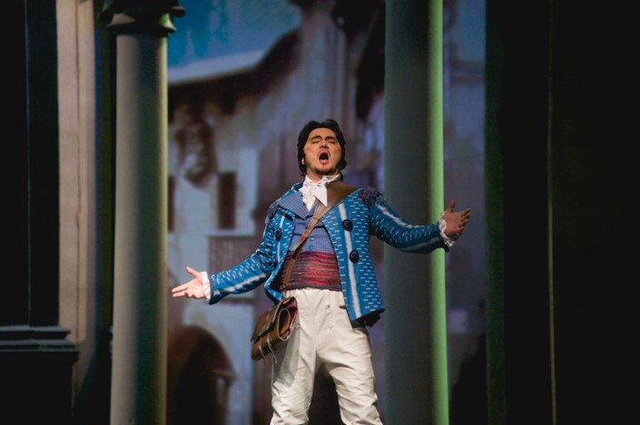 Когда на сцене появляется Фигаро (баритон Сундет Байгожин), он сразу же очаровывает слушателей своим обаянием, красотой и мощью голоса, остроумием и ловкостью. Зал подхватывал и подпевал вместе с артистом знаменитые арии главного героя. Плут Фигаро Байгожина получился легким, изящным и в меру пронырливым. Под стать ему была и Розина (сопрано Салтанат Ахметова), в соответствии с ролью озорна, кокетлива, она с легкостью создавала интриги вокруг себя. И в общем ее образ получился цельным как вокально, так и артистически. Певица меняла костюмы прямо на сцене, здесь нужно отдать должное художнику по костюмам Франке Скуарчапино, потому что все наряды артистов - не просто оригинальные, но еще и модные, они выглядят весьма актуально и в наши дни.