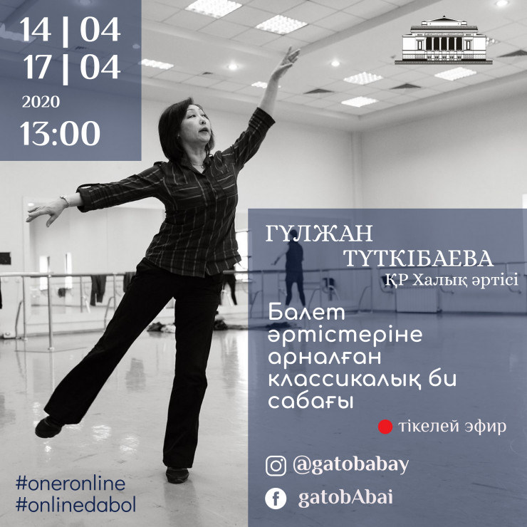 Казахский государственный академический театр оперы и балета имени Абая в рамках онлайн-проекта Gatob_Life представит ценителям балетного искусства "Урок классического танца с Гульжан Туткибаевой". 14 и 17 апреля в 13.00 на официальном канале YouTube @AbayTheatre пройдут первые занятия от художественного руководителя балета КГАТОБ имени Абая народной артистки РК Гульжан Туткибаевой.