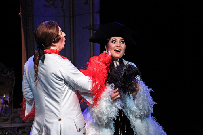 Высокий красавец Евгений Чайников в белоснежном камзоле, украшенном перьями и затейливой вышивкой - самовлюбленный дамский угодник Бланзак, который в итоге легко утешился заменой несостоявшейся невесты Джулии на влюбленную в него Лючиллу. Внешняя импозантность вкупе с сочным басом и отличной игрой сделали образ его героя запоминающимся.