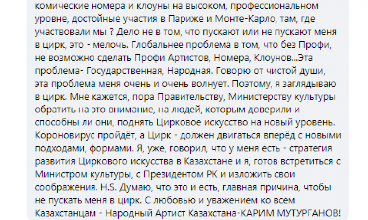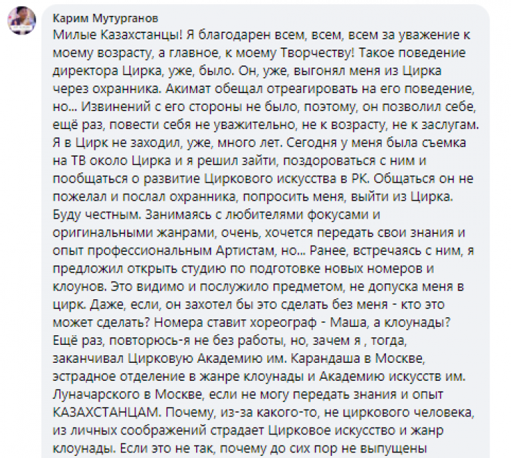 "Сегодня произошла не очень приятная ситуация в цирке города Алматы, в цирке, для которого мой папа Карим Мутурганов сделал очень многое за всю свою жизнь, в цирке, в котором я начинал свой творческий путь, одним словом, цирк Алматы - наш дом!