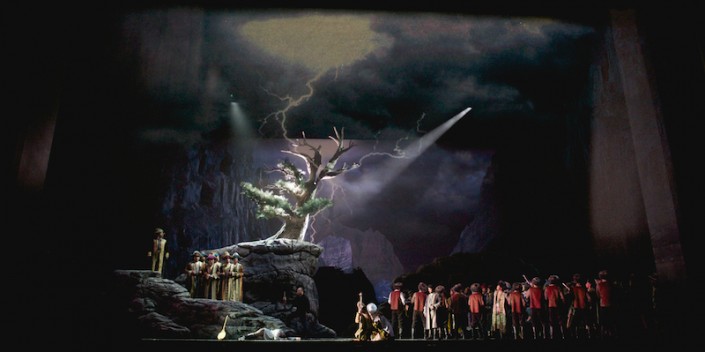 В спектакле очень много символизма. Начиная от восходящего солнца с летящей птицей (как символ свободной страны), заканчивая финальной сценой с водопадом (как знак очищения и вечной жизни). Хотя спектакль заканчивается трагически: главные герои погибают, но слушатели понимают, что любовь сильнее смерти…