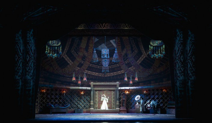 Невероятные впечатления захватили зрителей, как только открылся занавес: из-под сцены на глазах изумленной публики стал подниматься грандиозный город с ярмарочными гуляньями. Здесь можно было увидеть и торговца оружием, и великолепные напольные часы, и фаэтон с откидным верхом, запряженный лошадью. Жизнь била ключом. В эти моменты хотелось успеть рассмотреть все и сразу, не упустить ни одной детали. Вот метровая ваза из Китая, пушнина из России, ковры из Персии, патефон из Германии, огромные стопки старинных книг из Бухары. Фантастический технический и технологический театральный мир с почти живыми картинами природы, изображенными на 3D проекциях, совсем сбил с толку: где же реальность, а где вымысел? Художники-постановщики оперы - Софья Тасмагамбетова и Павел Драгунов, дизайнер по проекциям - Серджио Металли, художник по свету - Якопо Пантани проделали колоссальную работу. Почти фотографически они передали культуру, традиции и быт казахского народа.