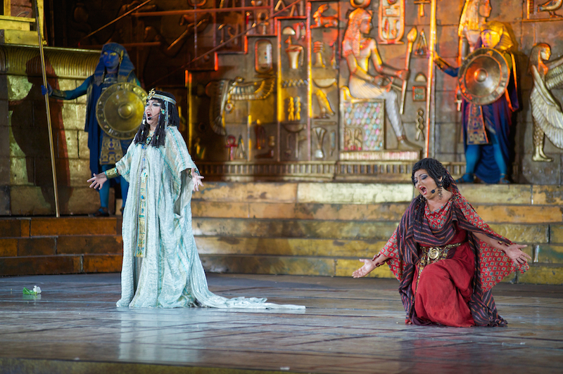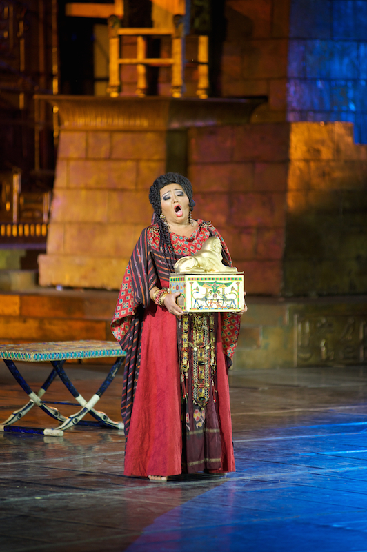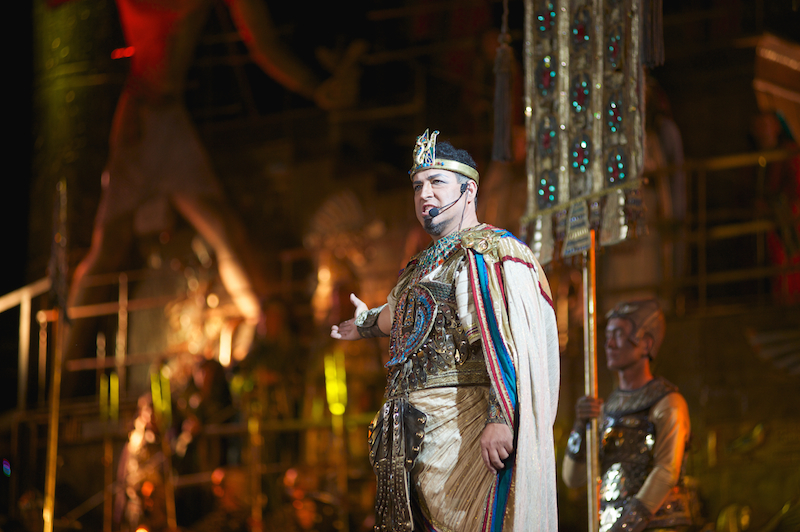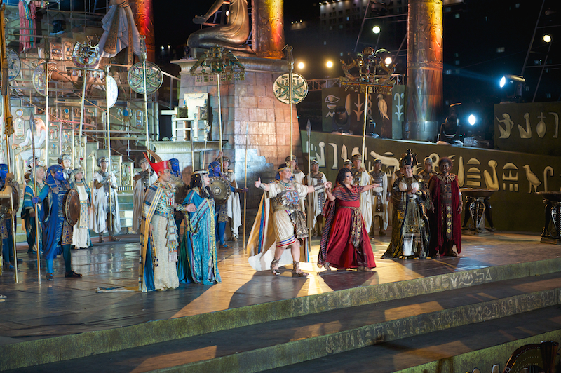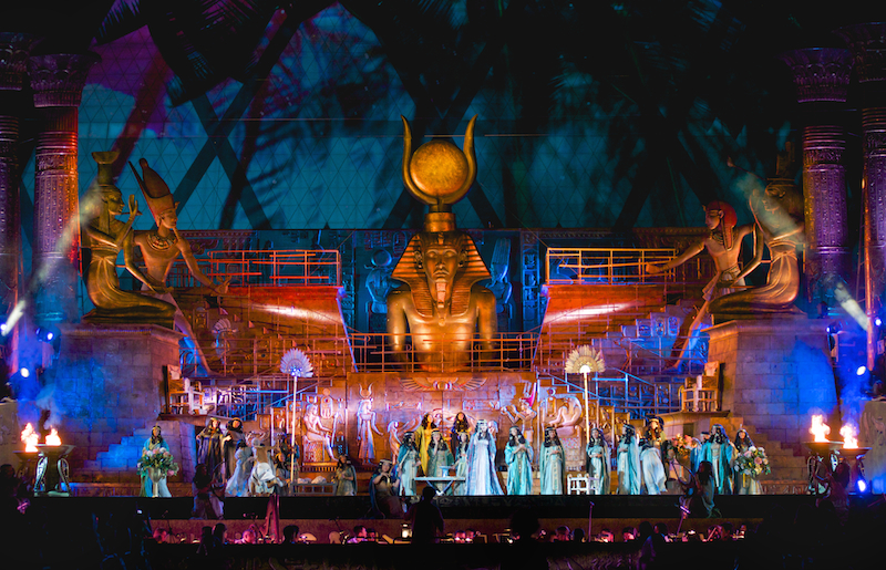 Роскошные декорации, созданные по эскизам выдающегося сценографа и режиссера Франко Дзеффирелли, дополнили гигантские видеоинсталляции. Также во время оперы были использованы специальные световые эффекты. А финал сцены триумфа Радамеса завершился грандиозным фейерверком в честь праздника.