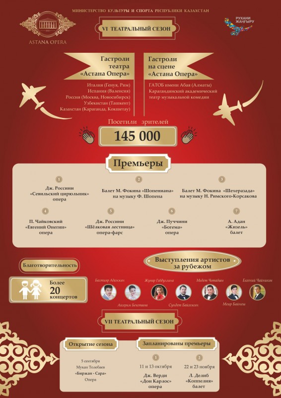 Шестой театральный сезон "Астана Опера" завершился представлением жемчужины национального музыкального искусства – оперой "Кыз Жибек" Брусиловского. Поклонники высокого искусства за этот театральный год не успевали следить, как одно яркое событие сменяло другое: премьеры, гастроли, победы на престижных международных конкурсах артистов оперы и балета, расширение творческих контактов театра с зарубежными коллегами и многое другое. И все-таки, если обратиться к статистике, то прошедший театральный сезон будет выглядеть так: