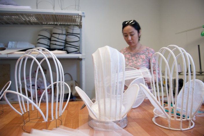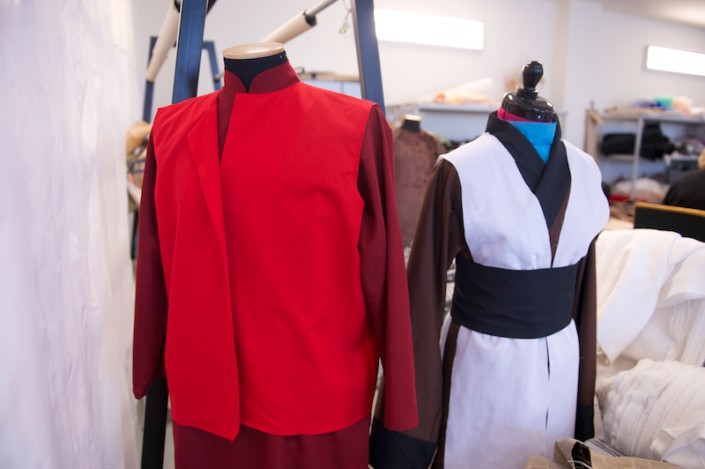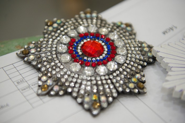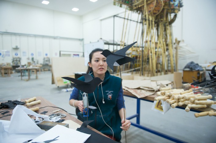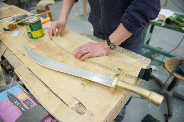 Перед бутафорским цехом стояла серьезная задача - создать множество мелких деталей, кропотливо инкрустировать ордена министров, выточить медали для принцев, которые потом украсят лацканы их костюмов. К слову, военная тематика проходит здесь красной нитью, а подтверждением этому служат растянувшиеся на столярном станке алебарды для палачей и стражников, мечи боевые, короткие, ритуальные, изогнутые сабли из металла и дерева. Бутафоры тщательно вытачивают рукоятки оружия, а вместо обычной стали для наконечников используют алюминий. И только потом вся эта красота декорируется и отделывается кожей. Кроме того, мастера изготовили ласточек на палочках, которые будут использоваться в танцевальных сценах. Для создания эффекта полета крылья сделали из материала, чтобы они легко могли двигаться.