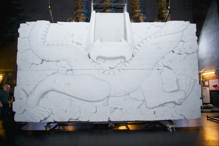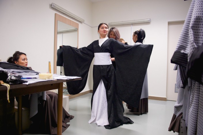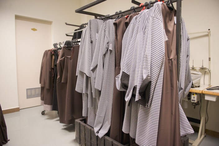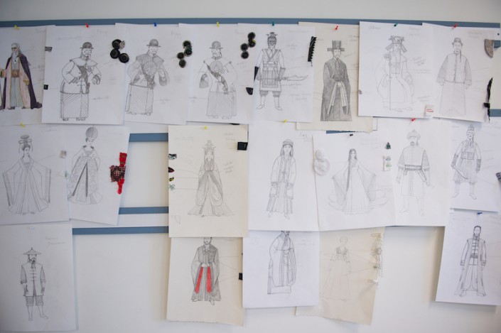 "Для изготовления костюмов мы использовали шелк, но в большей степени одну из дорогостоящих тканей - жаккард. Декорирование здесь вторично, а тесьма, пуговицы и вовсе не свойственны этой постановке. Сложность заключалась в особом китайском крое, которым мастерицы швейного цеха блестяще владеют. Кроме того, важна была фактура ткани, основная функция которой - держать форму костюма. Главная героиня Турандот всегда находится на глазах у публики, а это новая задача - переодевания должны происходить прямо на сцене. Таким образом, основной наряд будут попеременно дополнять четыре разных накидки. Последнее платье принцессы красного цвета. Всего мы пошили 247 костюмов, на них ушло более 2 тысяч метров ткани. Такой большой объем получился за счет переодевания артистов хора, изначально мы планировали, что они на протяжении всей постановки будут в одних костюмах, но потом было решено их увеличить за счет еще одного переодевания", - заключила сценограф.