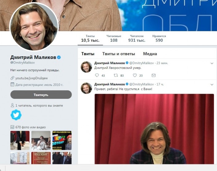 "Дмитрий Хворостовский умер", - написал в твиттере российский певец.