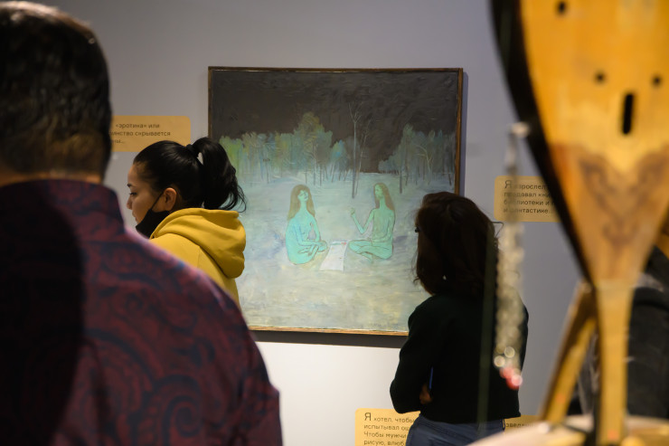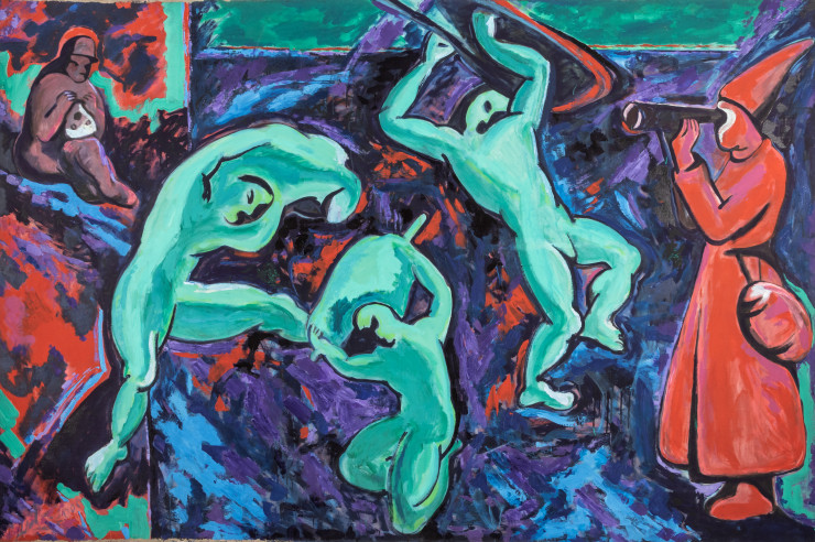 Работы рано ушедшего из жизни Молдакула Нарымбетова – художника-шамана, лидера группы "Кызыл трактор" - не показывались в Алматы уже много лет. На монументальном по размеру холсте Нарымбетов написал оммаж известной картине Анри Матисса "Танец". В композицию автор включил фигуры художников - соратников по "Кызыл трактору" Смайла Баялиева, Арыстанбека Шалбаева, Виталия Симакова, Саида Атабекова и самого себя - в процессе танца и музицирования, указывая на их собственные перформансы 1990-х годов, которые часто сопровождались шаманскими танцами и музыкой.