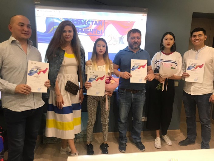 Победители конкурса "Казахстан моей мечты" с одним из членов жюри - актрисой Альмирой Турсын. Фото Tengrinews.kz