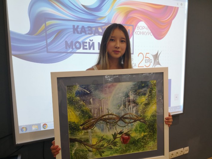 "Я хотела показать Казахстан процветающим и имеющим светлое будущее. Мост олицетворяет связь поколений, с традициями, яблоко - это символ Алматы, а космические здания - это высокие технологии. Рада, что моя работа всем понравилась", - поделилась впечатлениями София.