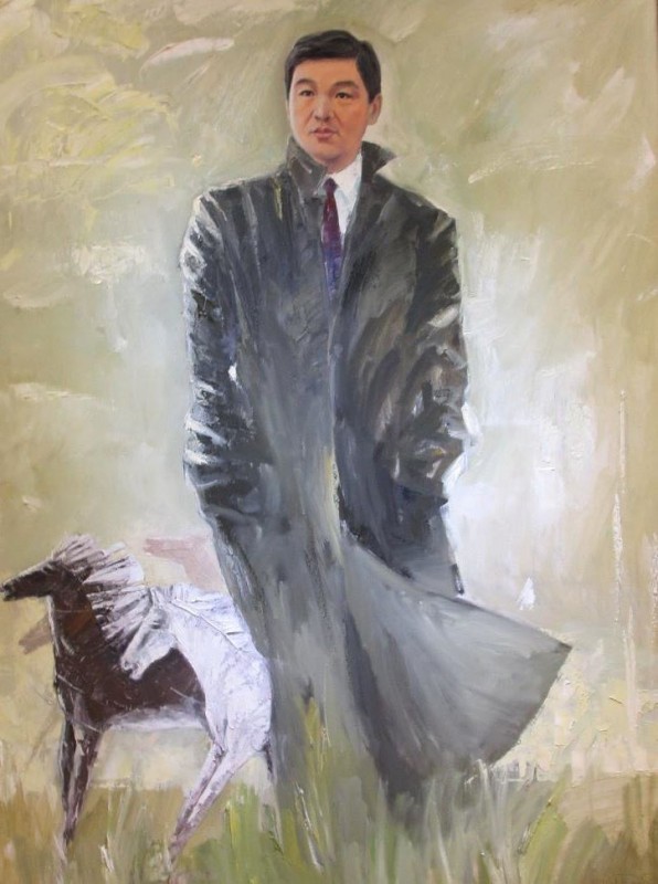 Автор картины рассказал, что картина называется "Моя молодая республика". "Все говорят, что человек на картине похож на Бауыржана Байбека. Конечно, это так, а что тут скрывать. Он не позировал. Я рисовал по фотографии, в Интернете очень много его фотографий", - рассказал художник.