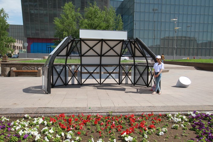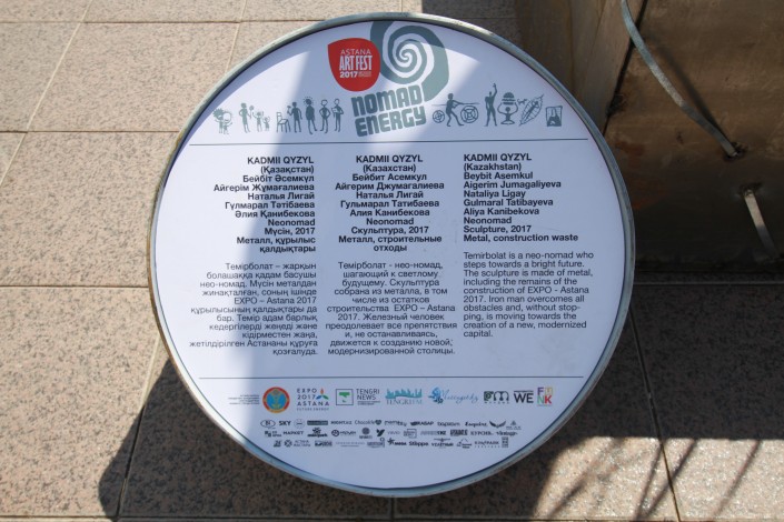 "Художник Каиржан Токишев делал перерыв в своей карьере, но мы рады, что благодаря фестивалю он вернулся в строй с такой замечательной работой. Это работа о противодействии встречному ветру. Несмотря на то, что она сделана из тяжелого железа, тонкие элементы, полоски дают нам воздушность, она очень хорошо отображает потоки ветка", - сказала Малиновская.