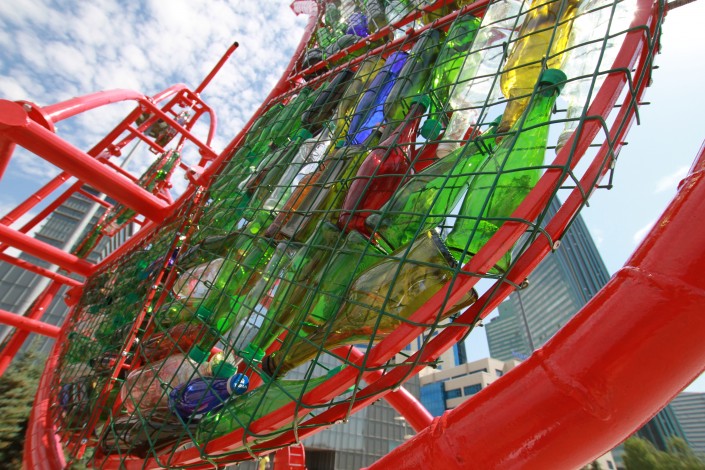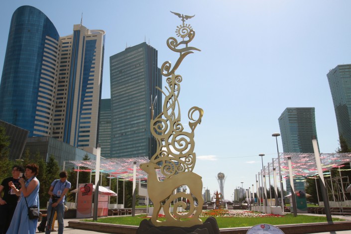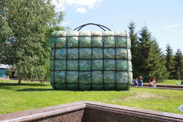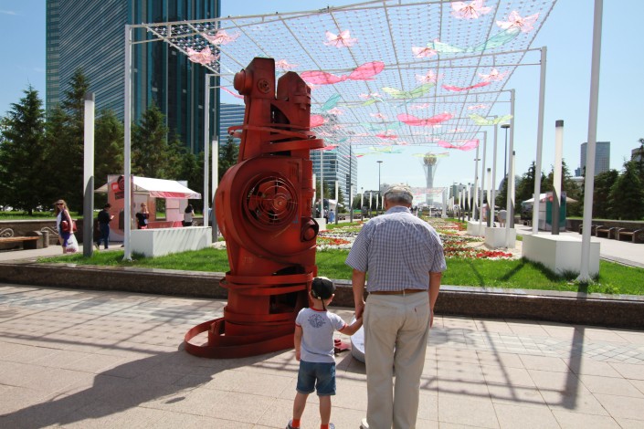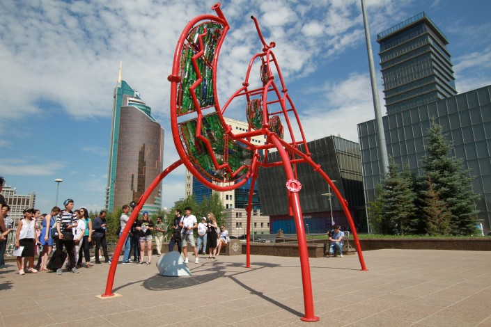 Известный казахстанский автор Эдуард Казарян в своей работе изобразил верблюда, везущего на своих горбах семью. В композиции использованы вторичные материалы, в том числе стеклянные бутылки.