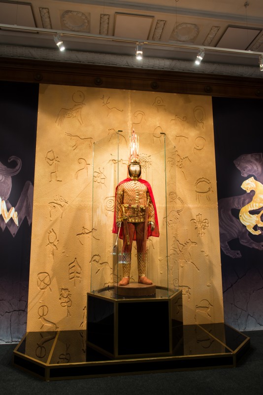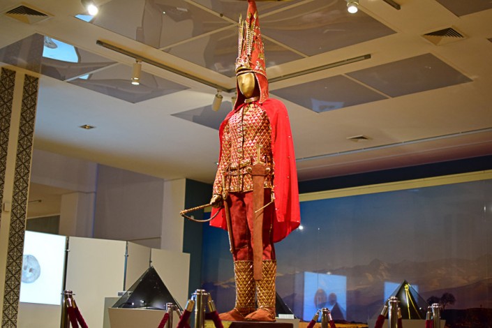 Основным экспонатом выставки является "Золотой человек", найденный в 1969 году в кургане Иссык в 50 километрах восточнее Алматы археологической экспедицией под руководством известного казахстанского археолога Кемаля Акишева. В погребальной камере археологи нашли свыше 4 000 золотых изделий. Все украшения костюма и головного убора вождя лежали непотревоженными в той последовательности, в которой они были нашиты на одежду. Все они являются произведениями искусства и относятся к памятникам скифо-сибирского звериного стиля.