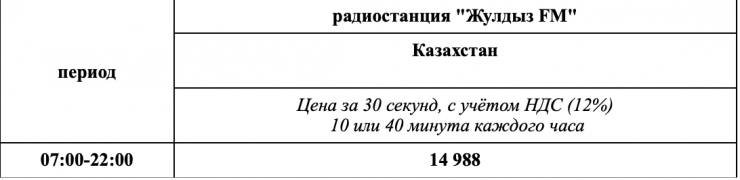 Предоставление эфирного времени на Радио осуществляется путем размещения аудиороликов, хронометражем не более 60 (шестидесяти) секунд на государственном и русском языках.