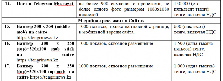 Стоимость размещения агитационных материалов на Сайтах "https://tengrinews.kz/" и "https://massaget.kz/" составляет: