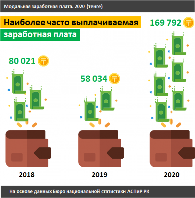 Отмечается, что в 2019 году самая распространенная (модальная) зарплата казахстанцев была равна 58 тысячам тенге.