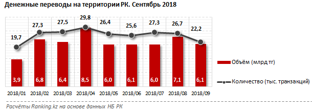 Наименьший объем переводов внутри страны был в январе - 3,9 миллиарда тенге и всего 19,7 тысячи транзакций.