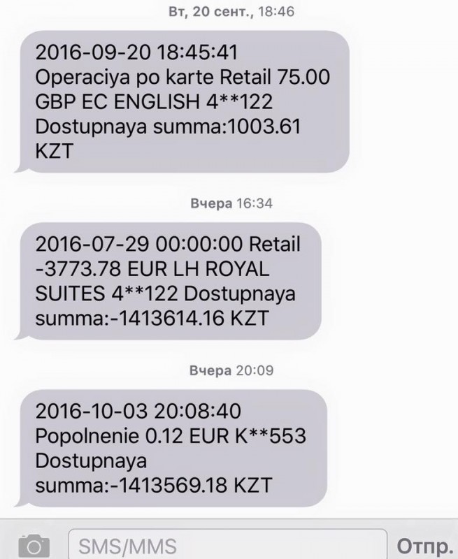 Гульжан Джакибаева получила SMS-оповещение 3 октября. "На моей карте было 1 003 тенге. Но вчера сняли 3 773 евро, то есть примерно 1,4 миллиона тенге (в тенге - прим. автора). Я на ровном месте оказалась должна банку, но этого не может быть. Я прибыла в Казком, написала заявление. Мне сказали, что в полицию обращаться не надо, сотрудники банка обещали разобраться в течение 30 дней", - говорит она.