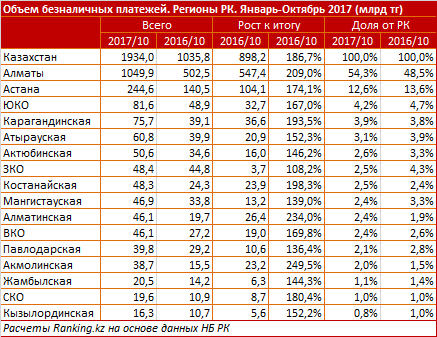 Замыкает тройку лидеров ЮКО с объемом безналичных платежей в 81,6 миллиарда тенге, рост за год на 67 процентов (32,7 миллиарда). Доля от РК сократилась с 4,7 процента до 4,2 процента.