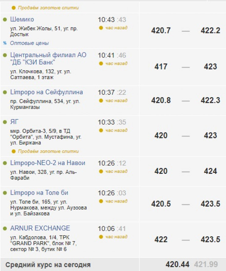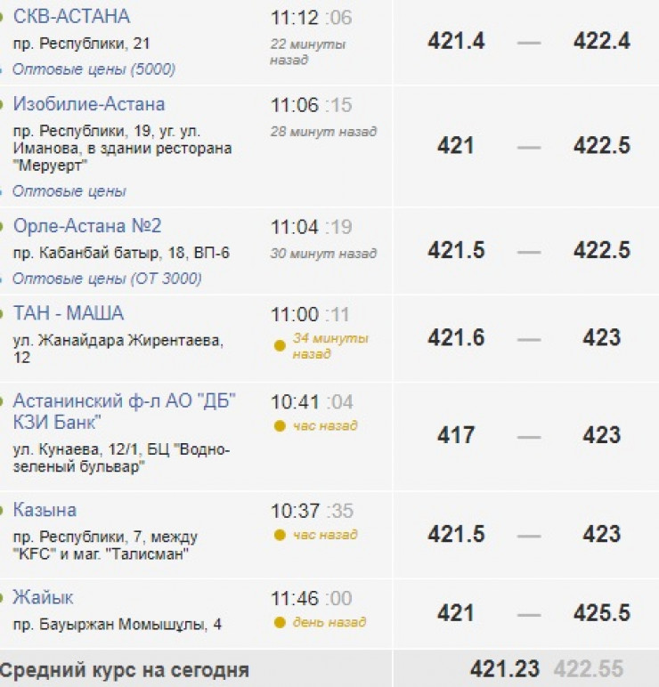 В обменниках Нур-Султана "иностранца" продают по 422,2-426 тенге, покупают по 417-421,6 тенге.