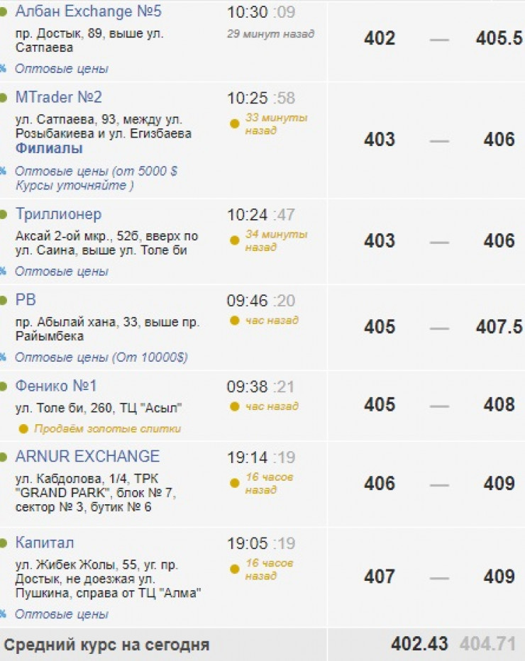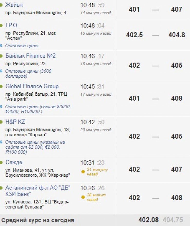 По данным Kurs.kz, "американец" подешевел и в обменниках. Так, в Алматы он стоит 404-406 тенге, лишь в двух пунктах его продают по 409 тенге. Средний курс равен 404,71 тенге.