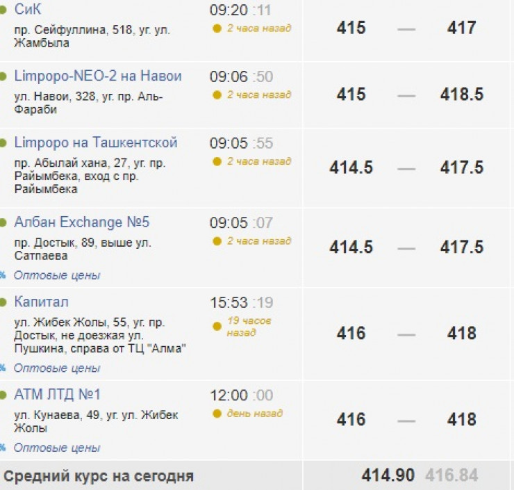 В обменных пунктах Алматы американскую валюту в среднем продают по 416,84 тенге. Минимальный курс доллара равен 416 тенге, максимальный - 418,5 тенге.