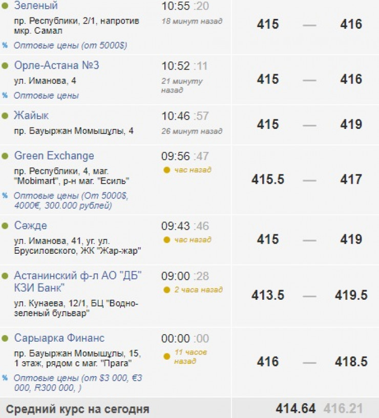 По данным портала, средний курс продажи доллара в обменниках Нур-Султана составляет к этому часу 416,21 тенге.