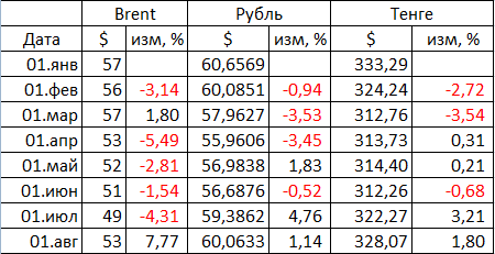 При этом из таблицы видно, что направление тенге менялось в соответствии с изменением нефти в четырех месяцах из семи. А направление движения рубля и тенге совпадало в шести месяцах. Исключением стал лишь март, когда рубль укрепился, а тенге, напротив, снизился.