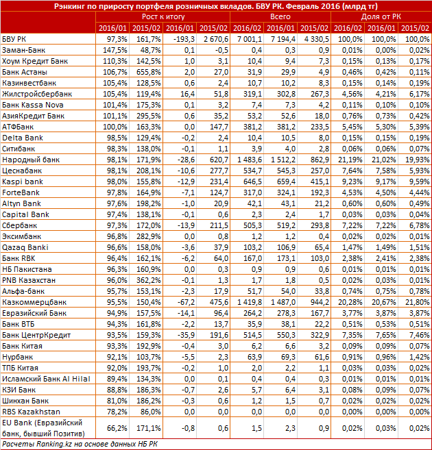 Кроме того, по их мнению, увеличить розничный портфель в феврале удалось всего восьми банкам из 35. "Лидер по приросту - Заман Банк, который с низкого старта за месяц нарастил объем депозитов почти в полтора раза. Однако на конец февраля его портфель составлял всего 440 миллионов тенге, на 57,5 процента меньше, чем годом ранее. А ставки по годовым депозитам - от 6,20 процента до 7,50 процента (самый низкий уровень на рынке). Очевидно, что политика банка не нацелена на массовое привлечение вкладчиков", - пояснили специалисты.
