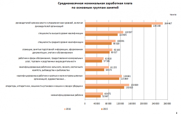 Дифференциация заработной платы по группам занятий и по профессиям (должностям) отличается и в региональном разрезе. В сентябре 2016 года у руководителей организаций в Алматы и в Атырауской области сложилась наиболее высокая заработная плата - 920 тысяч тенге и 716 тысяч тенге соответственно. Менее оплачиваемой эта должность была в Южно-Казахстанской, Жамбылской, и Алматинской областях, где руководители получали от 226 до 253 тысяч тенге. По регионам республики различие между максимальной зарплатой руководителя организации и ее минимальным значением составило 4,1 раза.