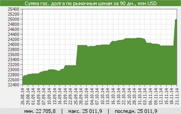 Согласно данным биржи, государственный долг РК по рыночным ценам на 21 ноября составил 25,01 миллиарда долларов. Напомним, что только 30 октября суммарная рыночная стоимость размещенных государственных облигаций, торгующихся в официальном списке KASE, составляла около 24,3 миллиарда долларов.