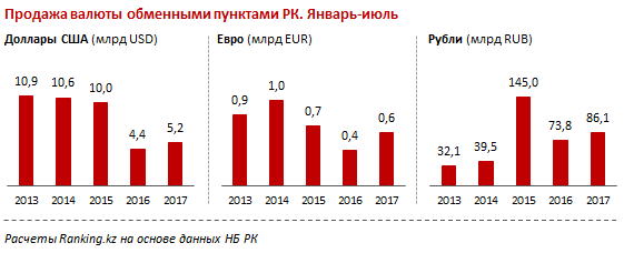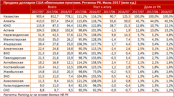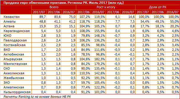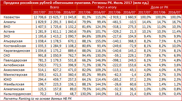По покупке рублей в июле 2017 года лидируют жители Алматы - 1,83 миллиарда рублей, спад за месяц составил 20,1 процента, за год - 0,6 процента.