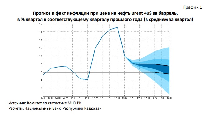 По данным финрегулятора Казахстана, при цене на нефть 40 долларов за баррель уровень инфляции в 2017 году будет находиться в целевом коридоре 6-8 процентов, в 2018 году начнет плавное вхождение в коридор 5-7 процентов.
