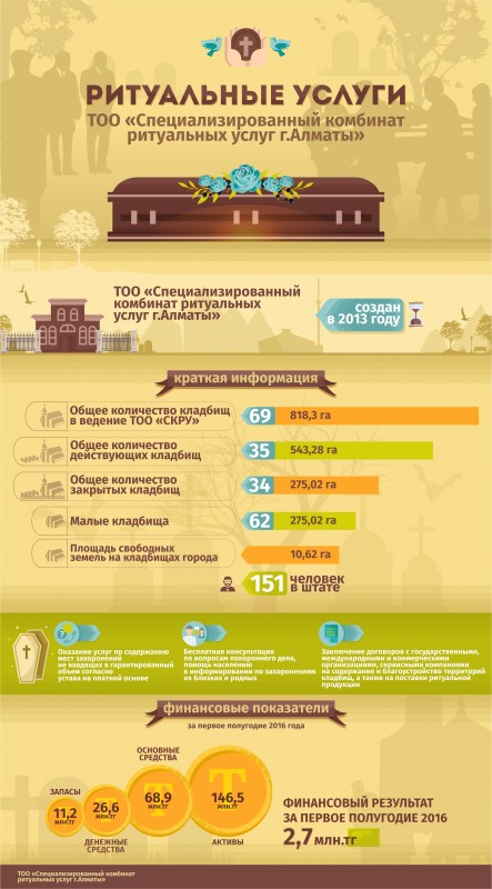 "Этот актив был создан в 2003 году постановлением акимата Алматы и на сегодняшний день создает рабочие места для более чем 150 человек, которые оказывают услуги по содержанию мест захоронения, находящихся на всей территории города. Также данная организация заключает договоры с государственными, международными и коммерческими организациями на содержание и благоустройство территорий кладбищ, занимается поставкой ритуальной продукции и проводит консультации по вопросам похоронного дела", - комментируют в акимате.