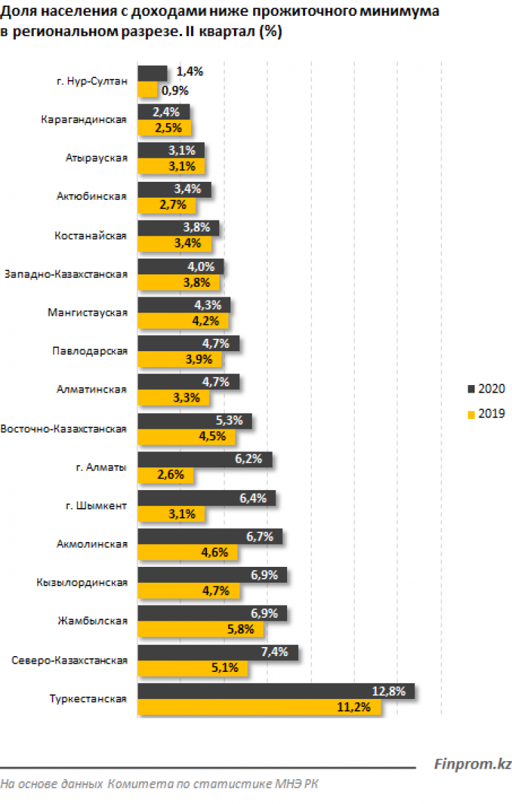 Рост доли населения с доходами ниже прожиточного минимума наблюдается почти во всех регионах страны. Наибольшее значение уровня бедности во втором квартале текущего года зарегистрировано в Туркестанской (12,8 процента), Северо-Казахстанской (7,4 процента), Жамбылской (6,9 процента), Кызылординской (6,9 процента) и Акмолинской (6,7 процента) областях. В общей сложности в этих пяти регионах численность населения с доходами ниже прожиточного минимума составила 481,8 тысячи человек.