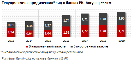 Соответственно, доля средств на текущих счетах юридических лиц в национальной валюте составила 47,1 процента, или 1,7 триллиона тенге (годом ранее - 48,9 процента, или 1,7 триллиона тенге).