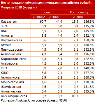 За январь текущего года объем нетто-продаж обменными пунктами российских рублей составил 44,4 миллиарда тенге. В среднем в январе один рубль стоил 5,8 тенге. Уже в феврале объем нетто вырос на 36,6 процента по сравнению с прошлым месяцем и составил 60,7 миллиарда тенге. В феврале в среднем курс составлял 5,7 тенге за один рубль.