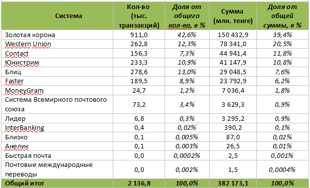 Лидером при переводах денег за рубеж и из-за рубежа в Казахстан остается Золотая корона. Также при отправке переводов денег значительны доли переводов денег через системы Western Union, Contact, Юнистрим, Блиц и Faster.