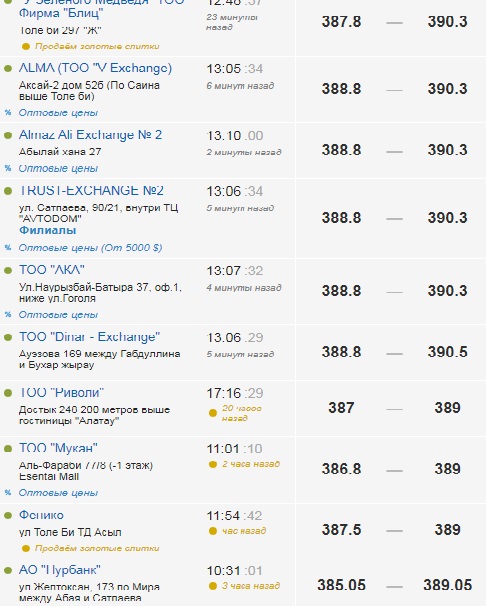 По данным Kurs.kz, в обменных пунктах иностранную валюту продают за 389,3 - 390,5 тенге.