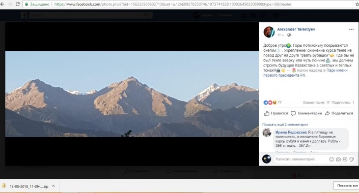 "Доброе утро. Горы потихоньку покрываются снегом. Укрепление/снижение курса тенге - не повод друг на друге "рвать рубашки". Где бы ни был тенге, вверху или чуть пониже, мы должны строить будущее Казахстана в светлых и теплых тонах!!"