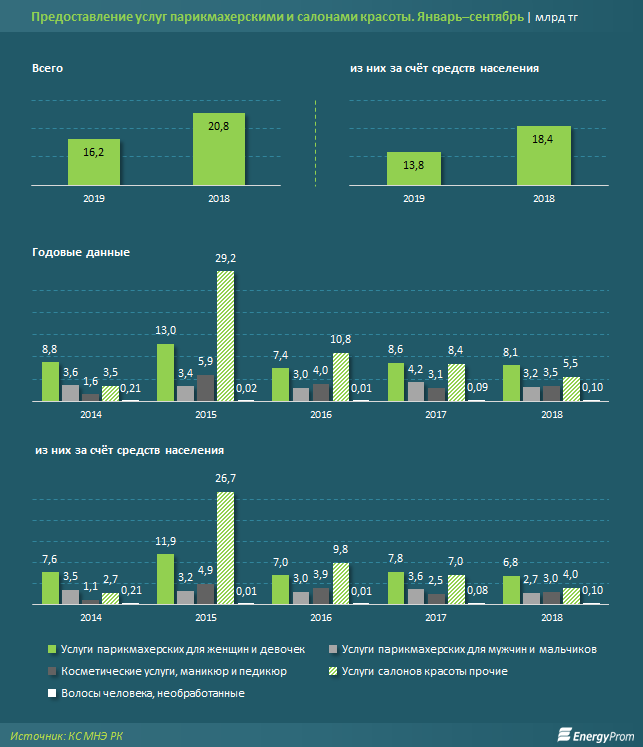 В то же время парикмахерские и салоны красоты стали зарабатывать меньше: за три квартала 2019 года их прибыль составила всего 16,2 миллиарда тенге против 20,8 миллиарда тенге год назад.