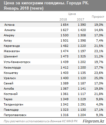 Самый высокий рост цен на говядину за год зафиксирован в Уральске - на 25 процентов, до 1 400 тенге, Кокшетау - на 23,6 процента, до 1 403 тенге и Жезказгане - на 23,1 процента, до 1 474 тенге.