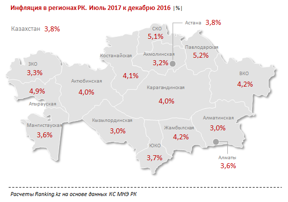 Наиболее активно в текущем году цены на товары и услуги росли в Павлодарской области. Прирост цен в июле по сравнению с декабрем 2016 года составил 5,2 процента.
