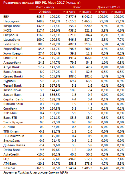 Лидером по абсолютному приросту розничных вкладов за последний годовой период является Народный банк - 149,8 миллиарда тенге. Объем вкладов физлиц в банке на конец марта 2017 года оценивается в 1,6 триллиона тенге, доля банка на депозитном рынке составляет 21,3 процента.