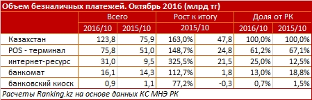 Сообщается, что розничная торговля стимулирует рост безналичных платежей. Так, в октябре через POS-терминалы казахстанцы оплатили покупки на 75,8 миллиарда тенге (рост на 48,7 процента за год), и еще на 31 миллиард тенге - через интернет-ресурсы (рост по сравнению с прошлым годом в 3,3 раза).