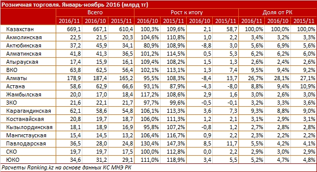 Примечательно, что положительную динамику обеспечили регионы, в то время как Алматы и Астана, концентрирующие 35,5 процента всего ритейла по РК, в минусе по отношению к октябрю 2016-го.